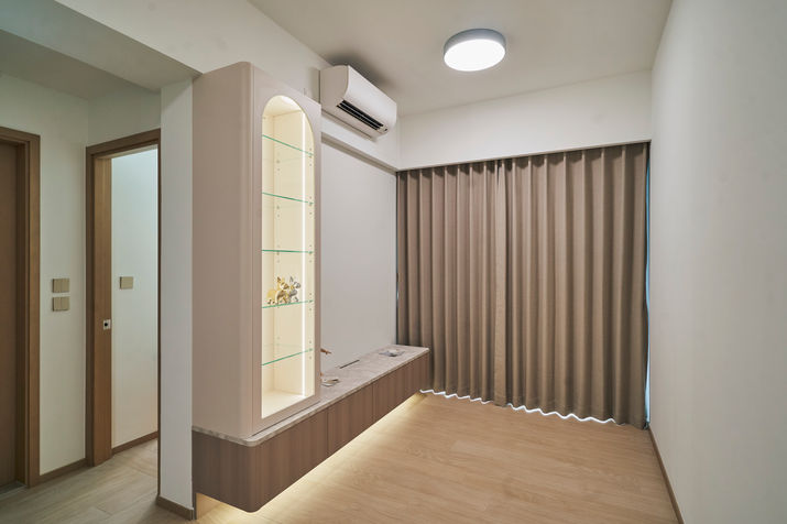 客飯廳則以連續櫃體串連空間,低矮設計保持通透感,同時提供充足收納。大理石紋檯面與圓角線條相互平衡,讓實用功能中多了一份柔和。展示櫃以拱形輪廓與暖光點綴,成為空間中的靜謐焦點,承載生活物件與日常記憶。