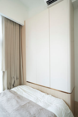 主人房以入牆式訂造衣櫃整合牆面,簡潔的分縫比例拉闊視覺高度,使空間更顯開揚。床背牆結合木紋層次與隱藏燈光,光線柔和而不刺眼,為休息時刻帶來安定而放鬆的感受。窗邊引入自然光,配合布簾的垂墜質感,令整體氛圍更顯溫暖舒適。