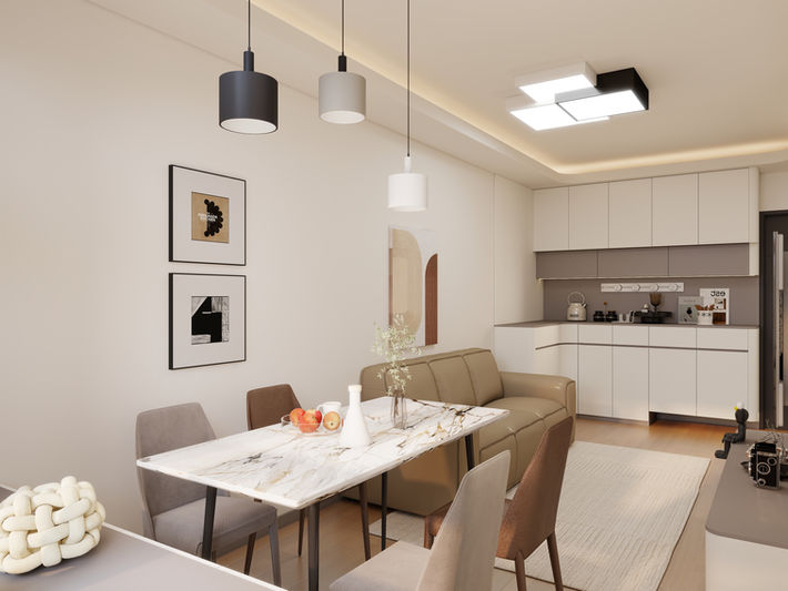 客飯廳 採用開放式布局,視覺更為開揚。背景牆以簡潔線條配合隱藏收納,減少多餘裝飾,讓空間保持整齊清爽。天花加入柔和燈槽設計,光線平均分佈,營造溫暖而不刺眼的氛圍,無論日常休息或用餐,都感覺舒適自然。