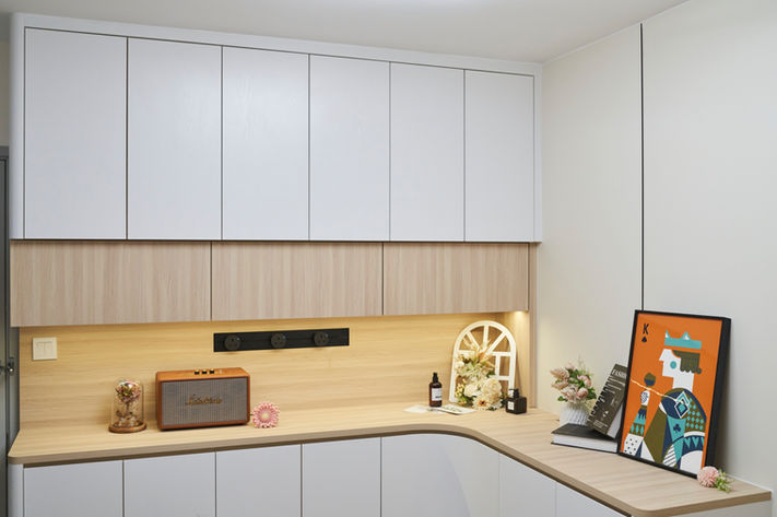 木與白的對話,勾勒出簡約卻溫潤的居家氛圍。全屋以木紋元素作為基調,搭配潔淨白色,令空間明亮而純淨。圓角櫃體設計柔化了線條,既安全又細膩;大面積隱藏收納則讓生活保持整潔有序。