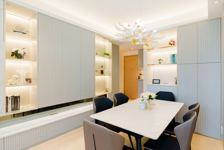 整個空間以淺木與霧白作為主調,透過線條、材質與光影的組合,形塑出乾淨、安靜、卻極具層次的住宅語言。客飯廳主牆以大面雲石紋與立體直紋板拼接,線條俐落分明;暖光展示櫃採光盒式設計,使每件擺設在柔光中浮現,像延伸了生活故事的風景。