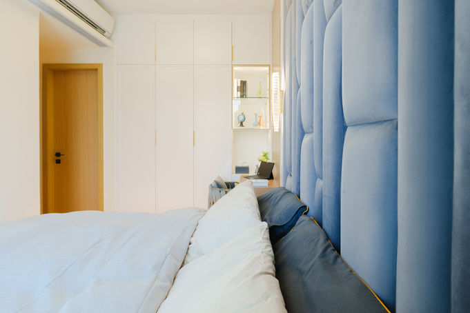 主人房延續相同語言,以霧藍絨布床頭作為空間主視覺,與木紋線板、雲石紋燈槽拼接出多層次的高級感;柔軟與硬朗材質的交錯,為休息空間帶來恰到好處的靜謐。衣櫃以霧面白與金屬點綴收口,保持整體畫面純淨。
