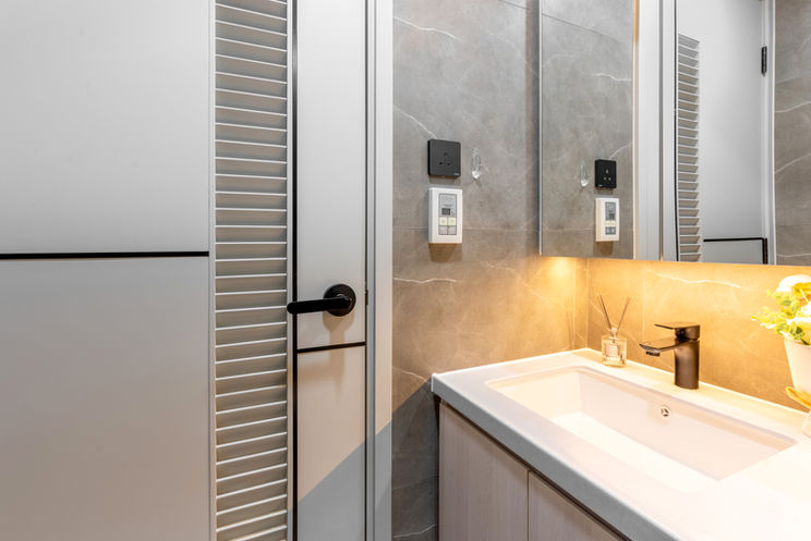 主人房極簡的灰色輔以灰藍色,均衡空間的色調。而灰色衣櫃搭配金鋼線條點綴, 在簡潔的線條勾勒下,使整體更具藝術性。睡床邊沿加裝燈條,營造出溫馨浪漫的氛圍,亦賦予空間高級的質感。